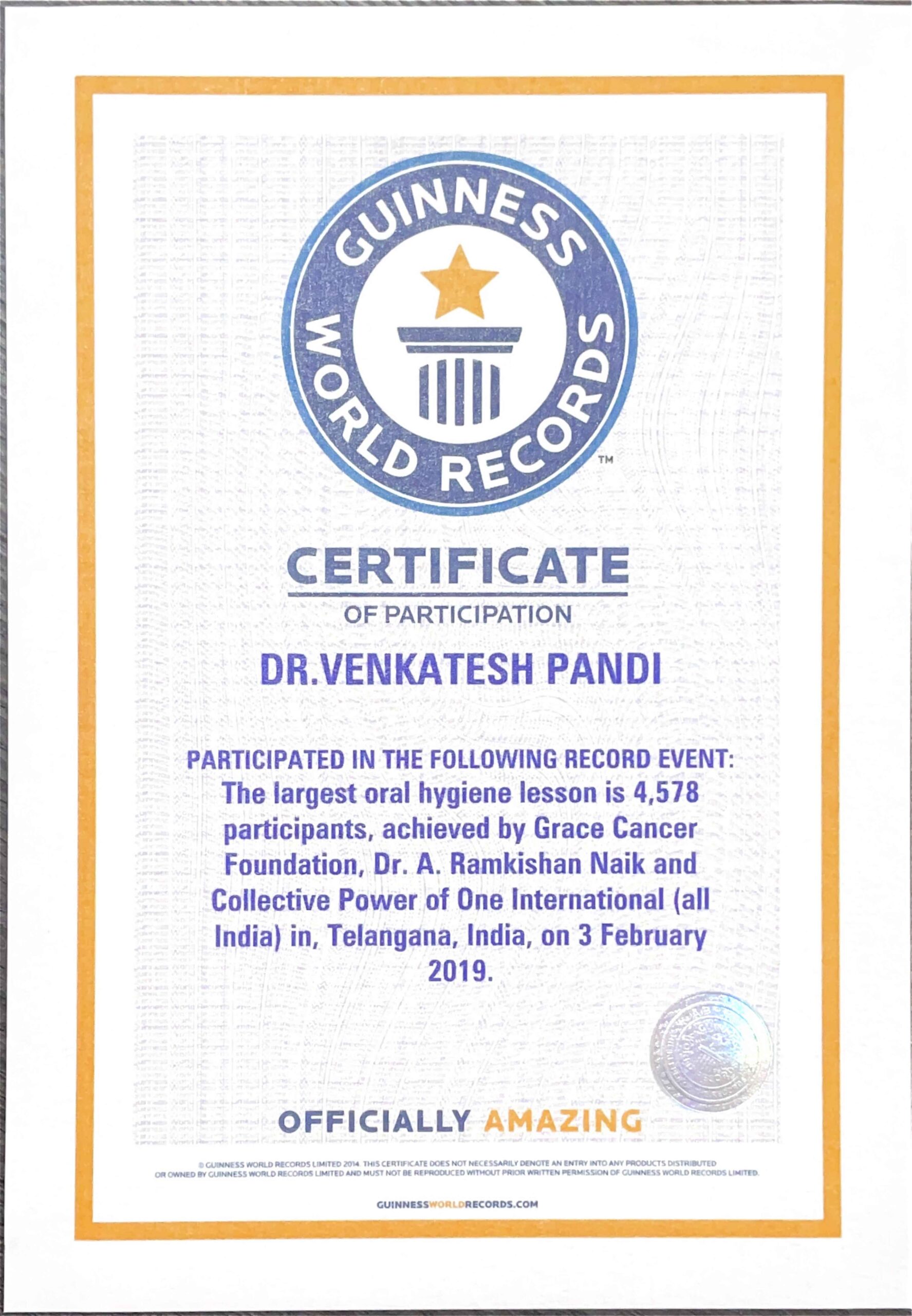 Beyond his professional achievements, Dr. Venkatesh has been recognized for his contributions to public health initiatives. Notably, he received a Certificate of Appreciation from the Guinness Book of World Records for his role in organizing the largest event on Oral Hygiene, involving 4,578 participants, in collaboration with Dr. Ramkishan Naik.